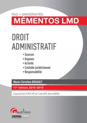 Droit administratif Acquérir les connaissances qui me sont nécessaires 11e édition 2015-2016 Le contenu du livre Le terme administration désigne à la fois une fonction et l'organe qui l'exerce, une activité et une organisation.Au sens d'organisation, l'administration se compose de l'ensemble des organismes assurant les interventions de la puissance publique dans la vie sociale (pouvoir central, autorités locales, établissements publics).Au sens d'activité, l'administration désigne les fonctions de ces organes, qui entretiennent des rapports entre eux et avec les administrés et pourvoient aux besoins d'intérêt général.Cet ouvrage est une synthèse claire, structurée et accessible du droit qui s'applique à l'administration, le droit administratif. Le public - Étudiants en Licence et Master Droit- Étudiants des Instituts d'Études Politiques (IEP)- Étudiants au CRFPA et candidats à l'ENM- Étudiants des IPAG et candidats aux concours de la Fonction publique-